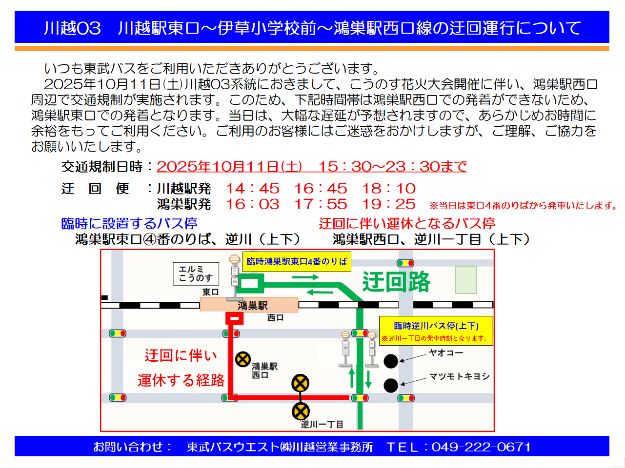 鴻巣駅西口発着の東武バス川越03系統バスにつきましては、鴻巣駅東口発着となります。